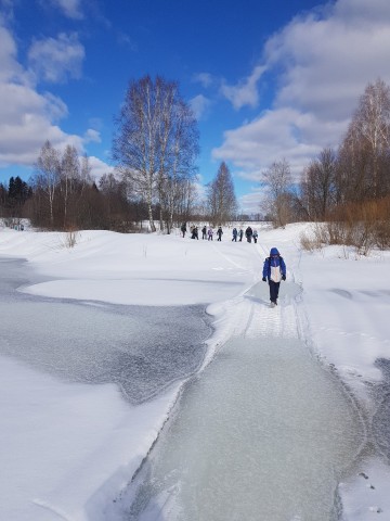 В первый день, мимо живописных снежных полей, лесов, рек мы шли до деревни, где двести с лишним лет назад останавливался Наполеон, отступая из Москвы. Мало что теперь напоминает о его присутствии и даже сложно представить какая гигантская армия проходила здесь.